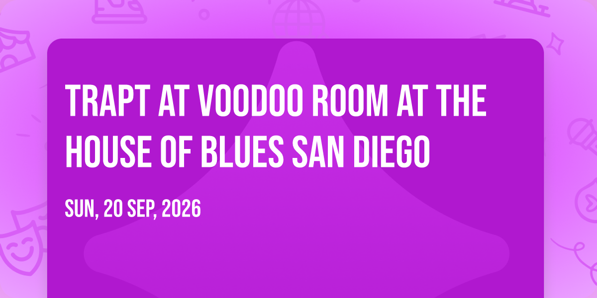 ✨ Experience the magic of Trapt at Voodoo Room at the House of Blues San Diego, where moments become memories that last a lifetime! 🏛️ The iconic Voodoo Room at the House of Blues San Diego in San Diego, CA sets the perfect stage for an unforgettable celebration on September 20th, 2026 at 07:00 PM. 🌟 It's been a curated experience that brings together the best of entertainment and innovation, creating an atmosphere of wonder and excitement. From the moment you arrive, you'll be immersed in a world where the ordinary transforms into the extraordinary. 🎊 Book early to secure your place in what promises to be an event that will be talked about for years to come!