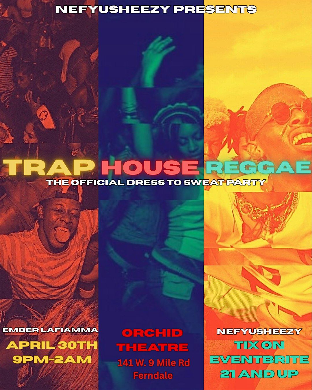 TrapxHousexReggae (The Dress to Sweat Party) is an event catered to those who enjoy dancing with their ugly faces, letting their hips do all the thinking, and sweating out their problems on the dancefloor. Our DJ's (NefyuSheezy and Ember LaFiamma) have catered their sets to bring you only the highest quality tracks, masterfully mixed for your listening and dancing pleasure. We are deeply looking forward to taking you on this journey.