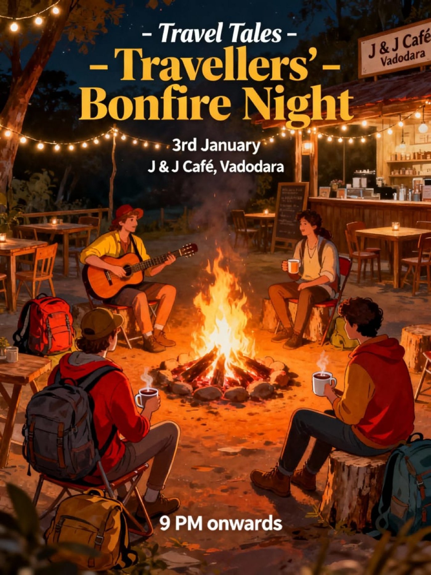 Get ready to ignite your wanderlust at the Travel Tales present Travellers' Bonfire Night! ππ₯ Join us on January 3, 2026, at 9:00 PM at the cozy J&J Cafe, located on Canal Road in New Alkapuri, Ankodiya, Vadodara, Gujarat 391330, India.