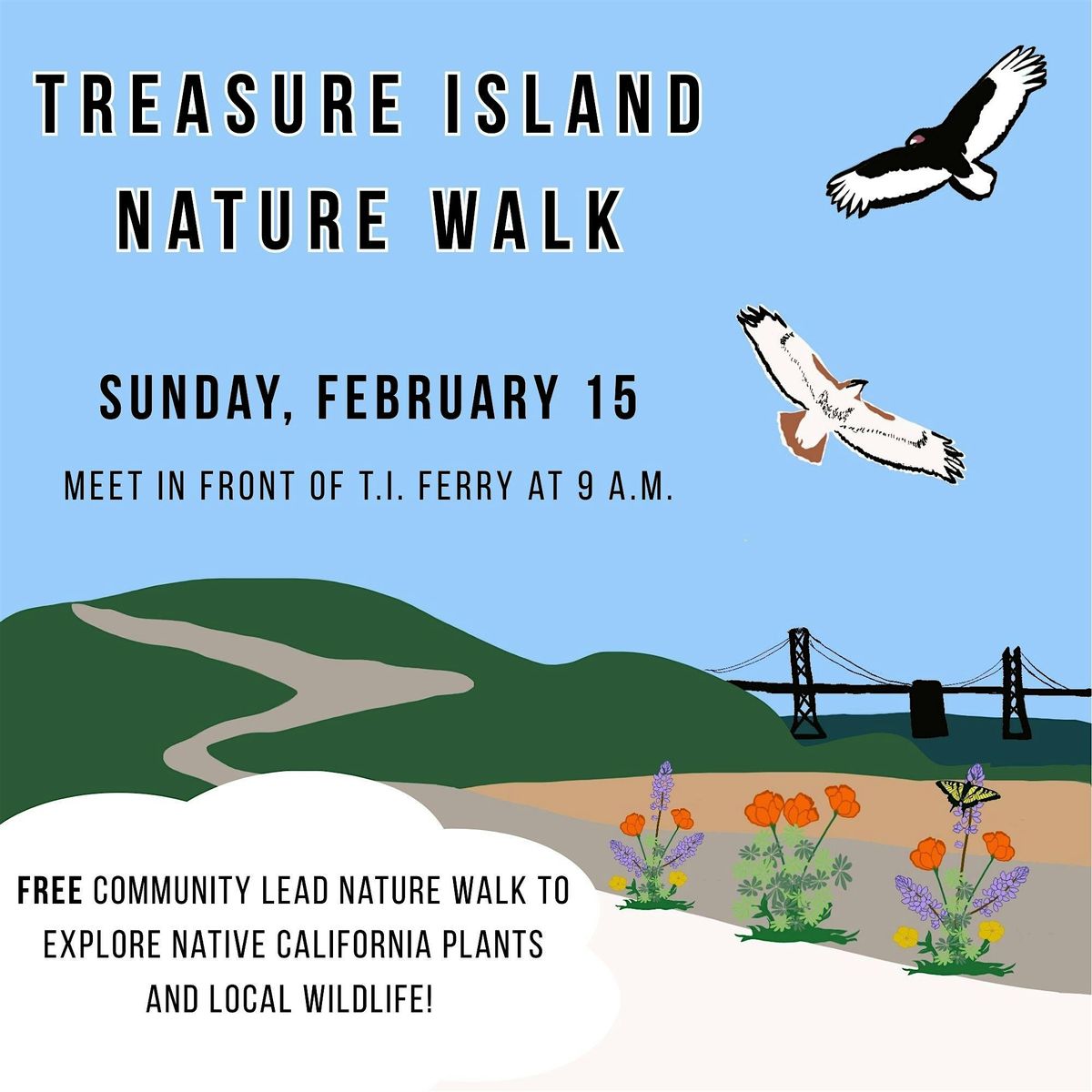 Come join us for a fun-filled adventure exploring the beauty of Treasure Island and Yerba Buena Island. This community lead walk will take you through the scenic Yerba Buena Island trail, showcasing native California flora and local fauna. Whether you're a nature enthusiast or just looking for a relaxing stroll, this event is perfect for all ages. Meet us at the Treasure Island Ferry Terminal and let's discover the hidden gems of this enchanting island together!