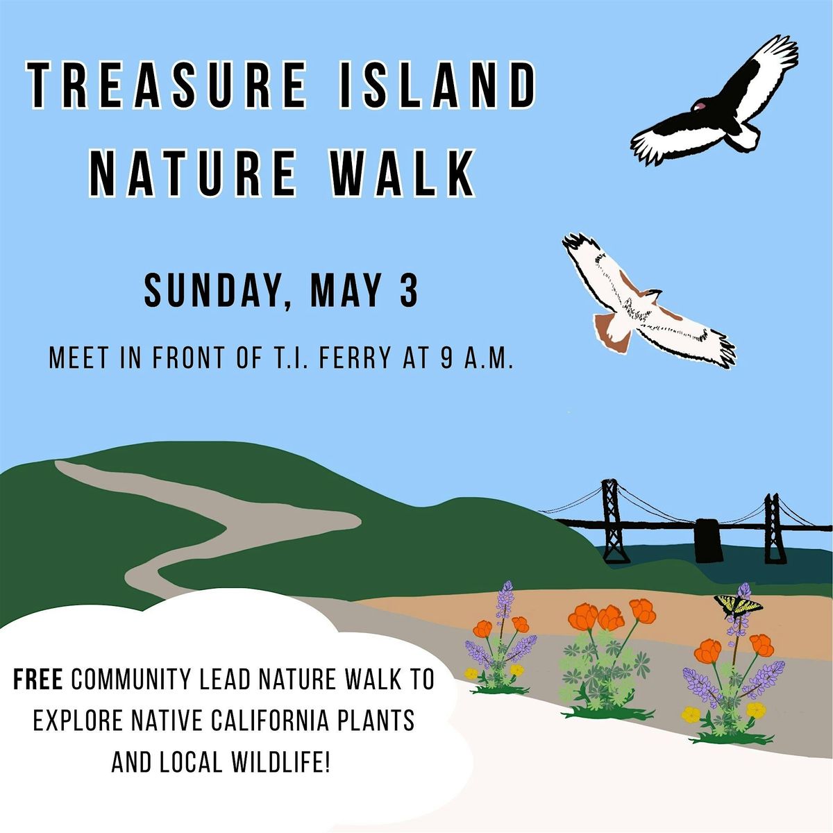 Come join us for a fun-filled adventure exploring the beauty of Treasure Island and Yerba Buena Island. This community lead walk will take you through the scenic Yerba Buena Island trail, showcasing native California flora and local fauna. Whether you're a nature enthusiast or just looking for a relaxing stroll, this event is perfect for all ages. Meet us at the Treasure Island Ferry Terminal and let's discover the hidden gems of this enchanting island together!