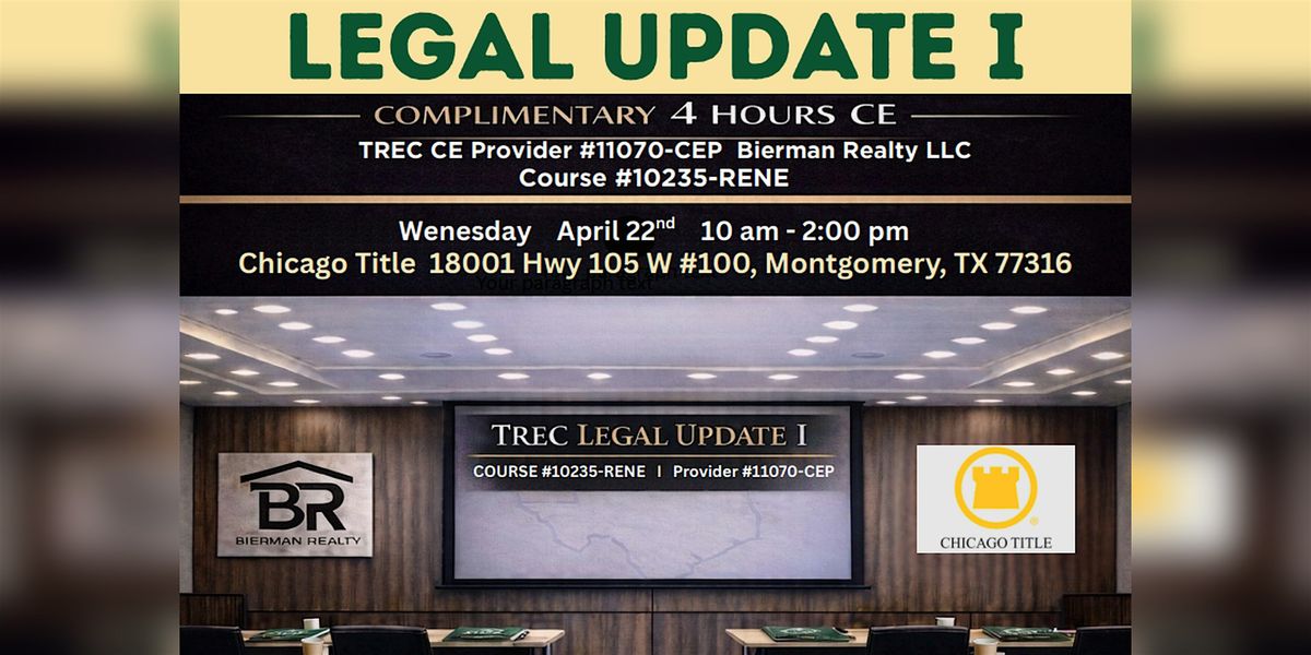 Join us in person at Chicago Title - in Montgomery TX for a complimentary Legal Update I class. Breakfast/Lunch provided. 9:30am Check-InAbout this Event
