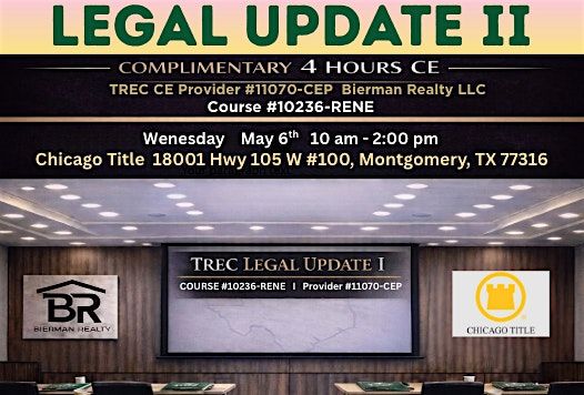 Join us in person at Chicago Title - in Montgomery TX for a complimentary Legal Update II class. Breakfast/Lunch provided. 9:30am Check-InAbout this Event