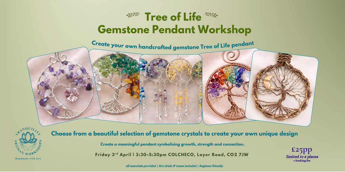 Join us for a relaxing and creative jewellery workshop where you will learn how to design and make your own wire-wrapped Tree of Life pendant using beautiful natural gemstones.