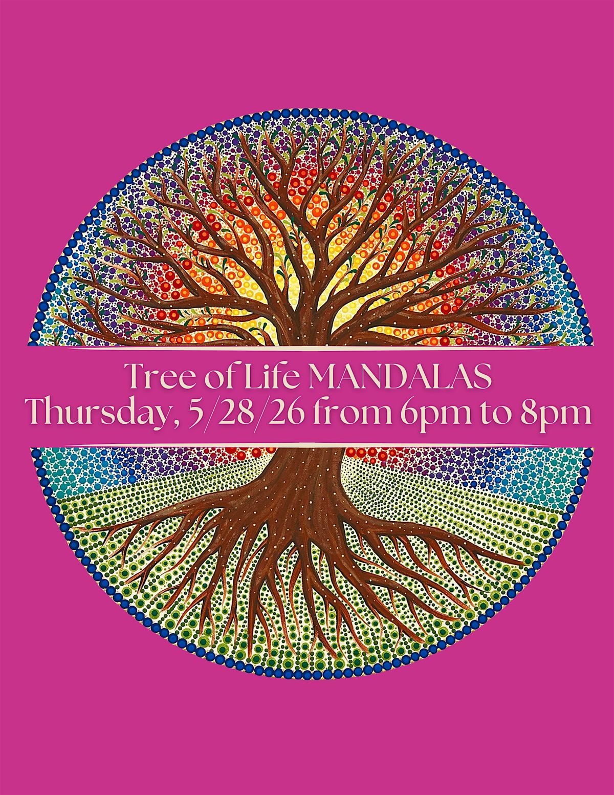 Join us for a Tree of Life Mandala Dot Painting & Wellness Class, where creativity and mindfulness intertwine. In this guided session, you’ll paint a beautiful mandala-inspired Tree of Life, a powerful symbol of growth, strength, connection, and renewal.