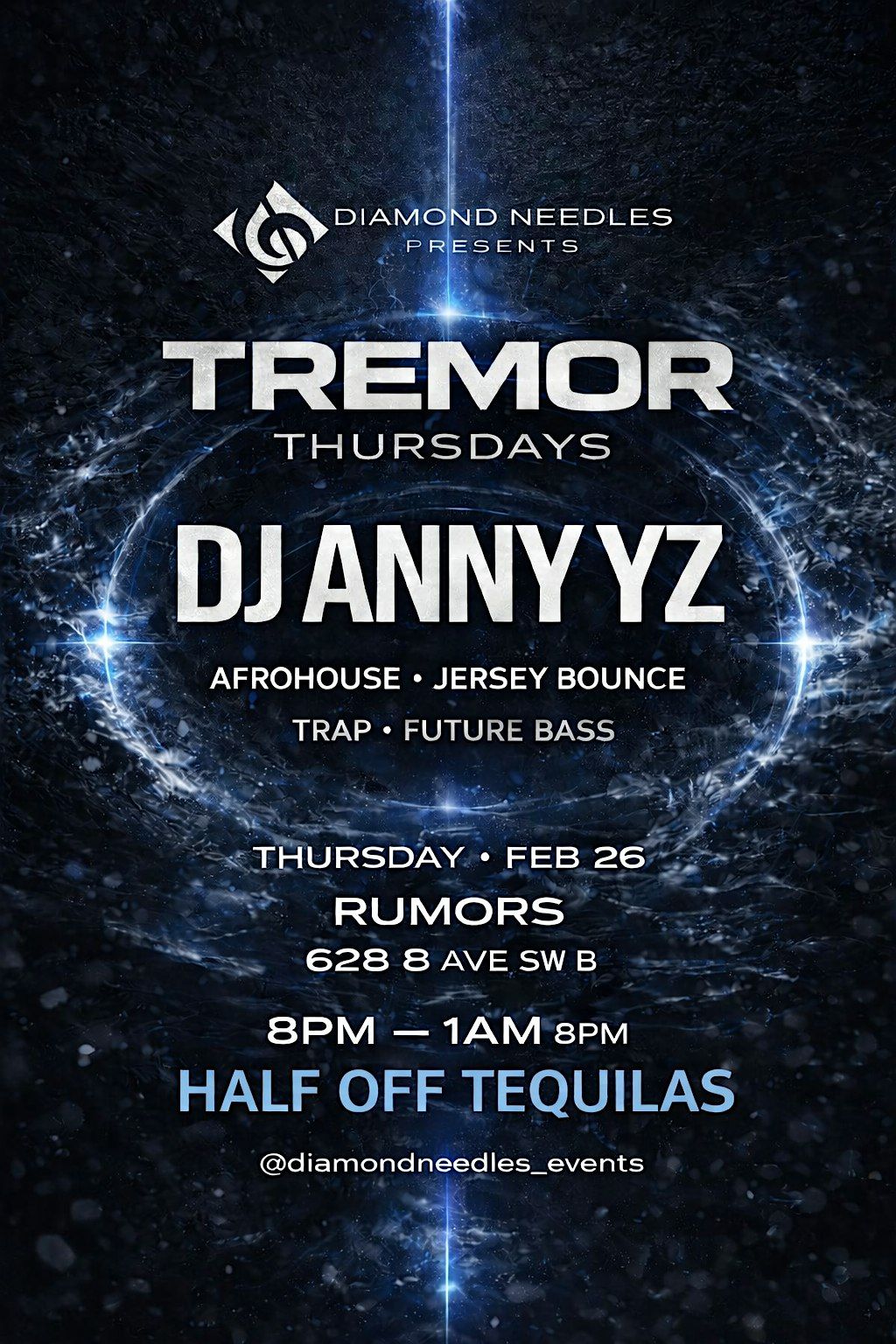 Feel the bass vibrations at Rumors nightclub, 628 8 Ave SW b, on February 26, 2026, at 8:00 PM - 01:00 AM, for Diamond Needles first Tremor Series featuring special guest DJs such as DJ Anny Yz spinning Afro, House, Jersey, Trap, Miami Bass remixes, and more!