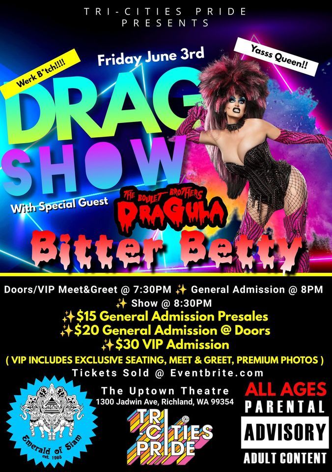 Join us on Friday night, June 3rd, at the Uptown Theater for the Tri-Cities Pride Festival Drag Show, partnered with Emerald of Siam! You will get to see some of your favorite local performers, as well as having our special guest, Bitter Betty, from The Boulet Brothers Dragula!