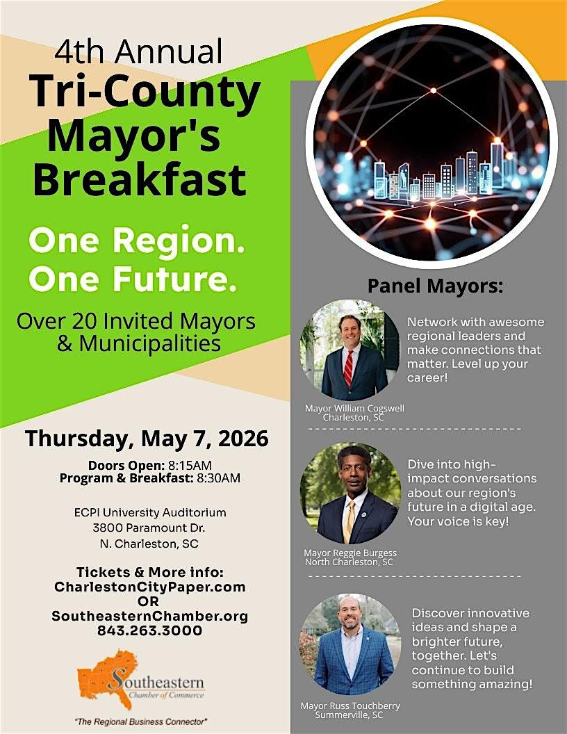 This year’s theme, “One Region. One Future.”, brings together the mayors of Charleston, North Charleston, and Summerville for a candid, forward-looking discussion on regional alignment, economic momentum, and the infrastructure required to sustain growth across the Tri-County.