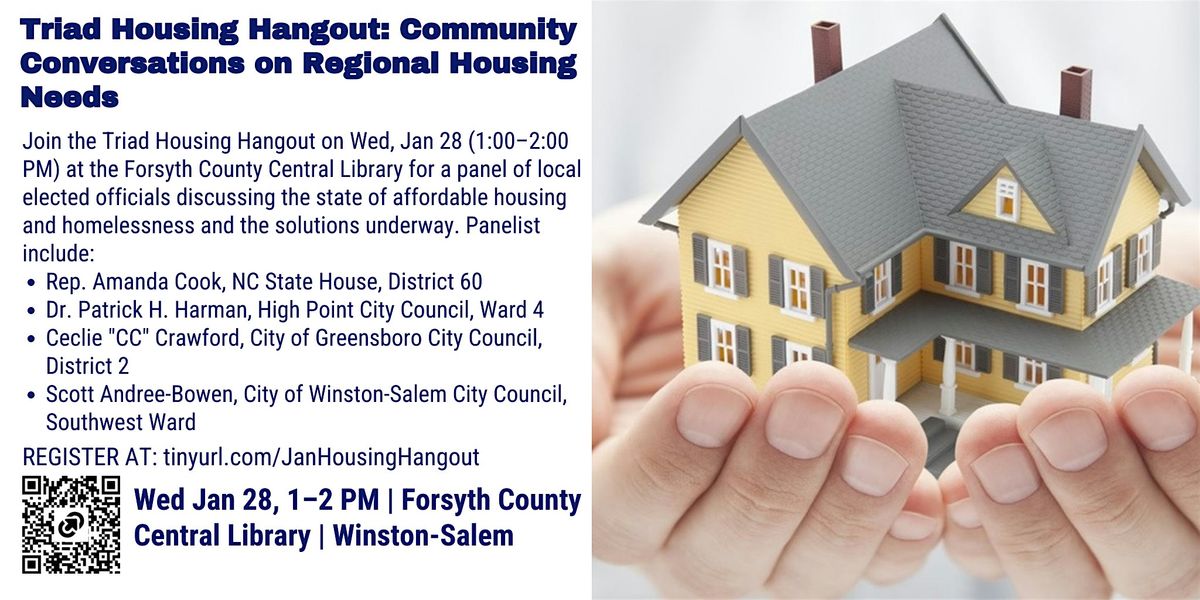 Join us for the next Triad Housing Hangout on Wednesday, January 28 (1:00–2:00 PM) at the Forsyth County Central Library, featuring a panel of local elected officials for a timely, solutions-focused conversation on the current state of affordable housing and homelessness in Forsyth County and the broader Triad.
