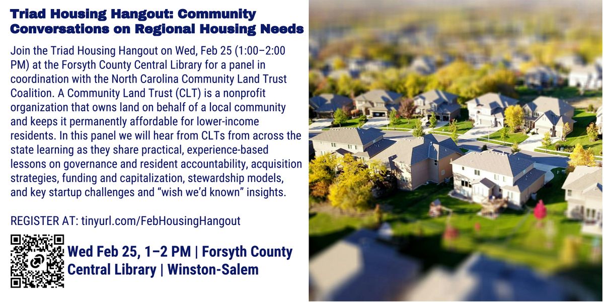 Join us for the next Triad Housing Hangout on Wednesday, February 25 (1:00–2:00 PM) at the Forsyth County Central Library, featuring a panel of North Carolina Community Land Trust Coalition members.