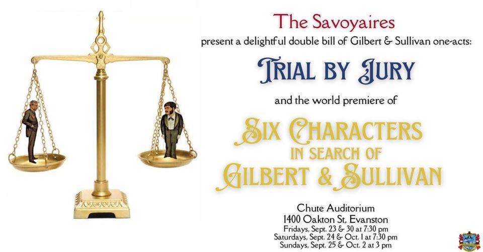 The Savoyaires present a delightful double bill of Gilbert & Sullivan one-acts: "Trial by Jury" and the world premiere of "Six Characters in Search of Gilbert & Sullivan" "Trial by Jury" was Gilbert & Sullivan's only one-act, written early in the famed team's career, and is a marvelously constructed send-up of law, grand opera, and human hypocrisy.