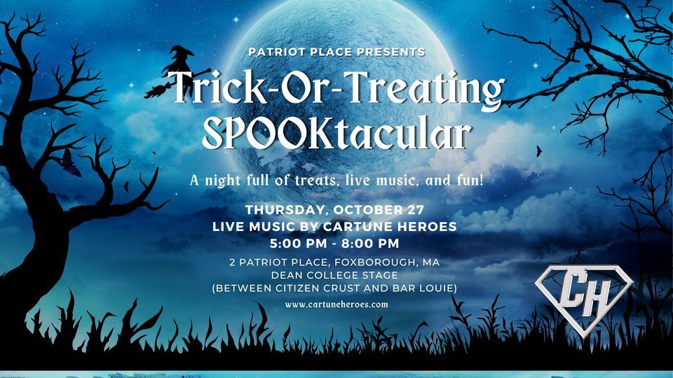 Ghosts and Goblins! You’re invited to the annual Trick-or-Treating SPOOKtacular presented by SNICKERS® at Patriot Place on Thursday, October 27! For 2022, there will be two sessions: 11:00 AM – 1:00 PM and 5:30 PM – 7:30 PM. Make sure to wear your best costume!CARTUNE HEROES WILL BE PERFORMING YOUR FAVORITE LIVE MUSIC OUTDOORS ON THE DEAN COLLEGE STAGE FROM