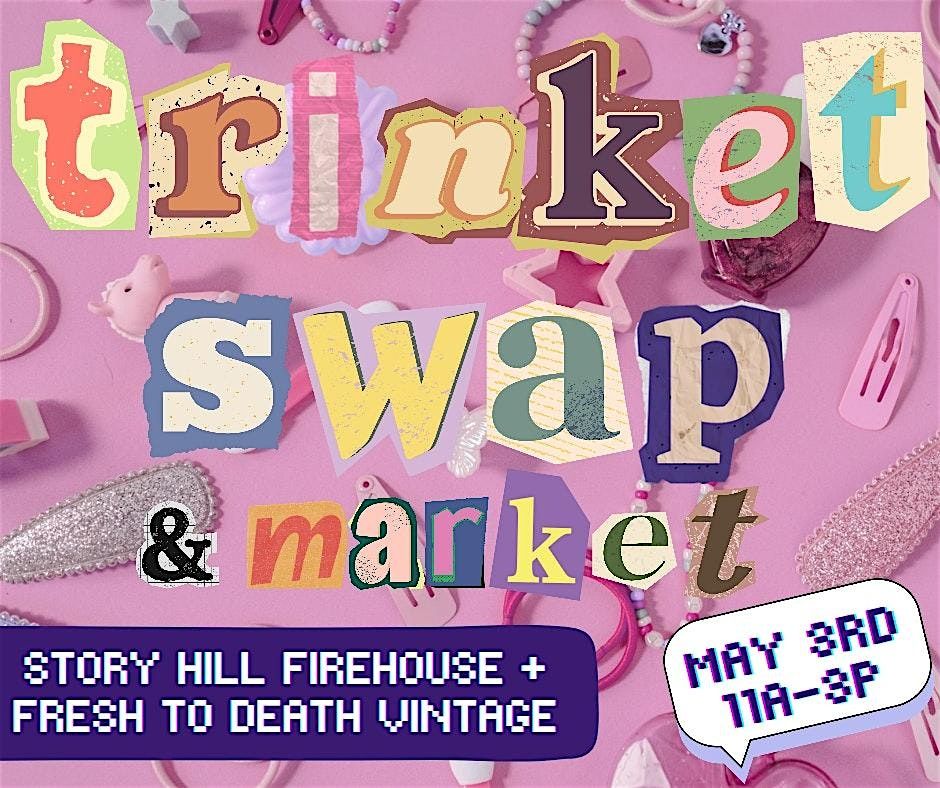 A “trinket” = anything that fits in your hand (think crystals, charms, pins, figurines, stickers, tchotchkes) No trinkets? No problem! Shop the vendors or check out the free swap table.