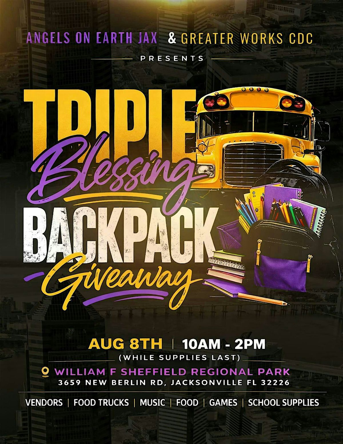 TRIPLE BLESSING BACKPACK BASH Join us for an unforgettable back-to-school celebration where we’re pouring into our youth and community in a BIG way! Date: August 8, 2026 Time: 10:00 AM – 2:00 PM Location: William Sheffield Regional Park- 3659 New Berlin Rd, Jacksonville FL 32226 FREE Backpacks & School Supplies (While supplies last!) Music • Community • Family Fun • Giveaways