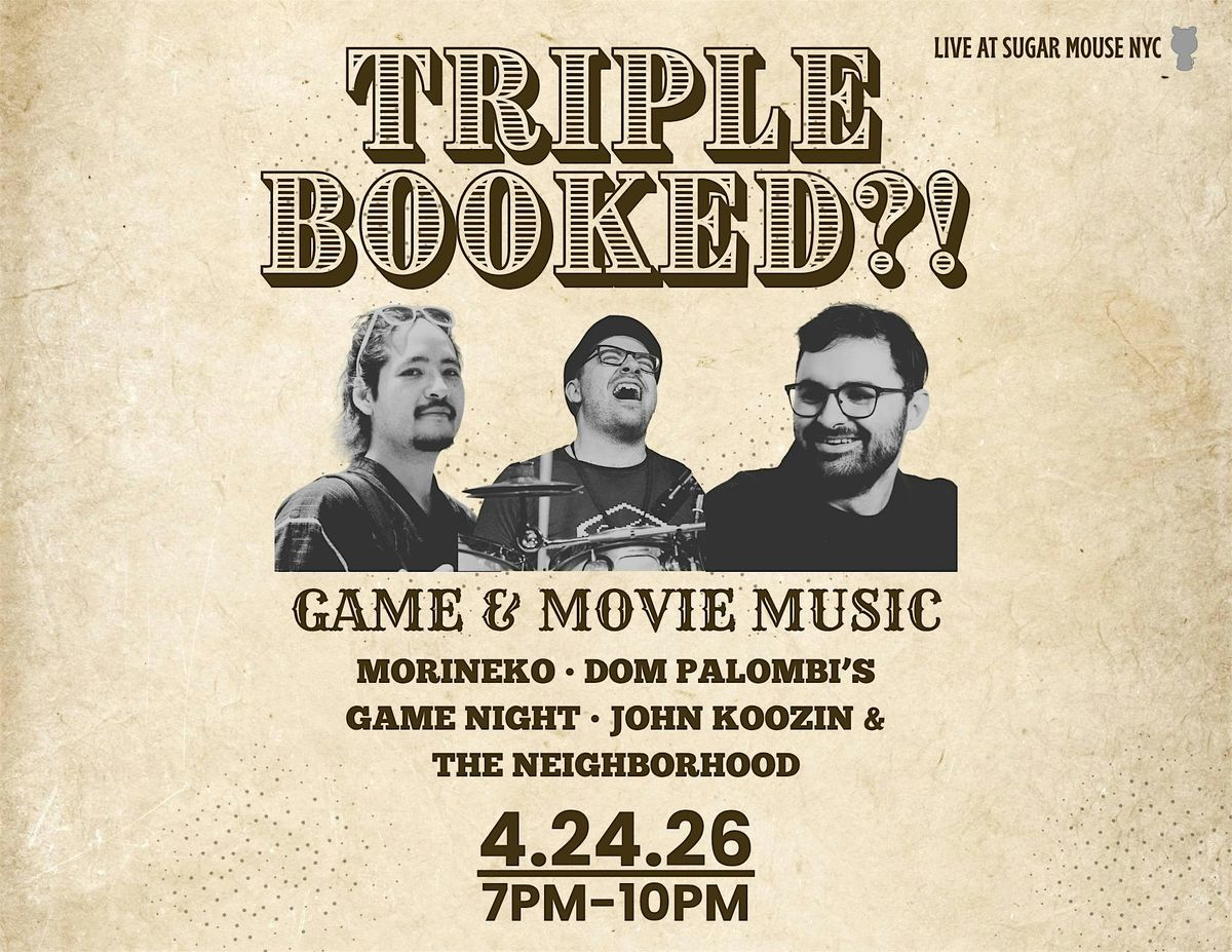 Three bands all sharing the same band members?! WE'RE TRIPLE BOOKED?!—a live music concert celebrating soundtracks from your favorite video games, anime, movies, and other beloved nerdy media. Featuring a powerhouse three-in-one-band lineup including Dom Palombi’s Game Night, John Koozin and the Neighborhood, and MORINEKO. Whether you’re a gamer, anime fan, film buff, or just love music, you’ll want to be part of the experience! While you enjoy the music, there are also pool tables, darts, free arcade consoles, and plenty of drinks! Come nerd out with us! 🤓🎵