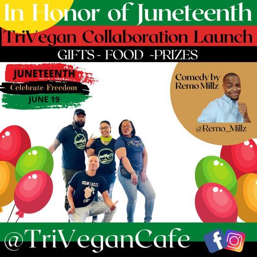 #JuneTeenth Family! Join us on June 19th to celebrate our TriVegan Café collaboration launch ? We're individual bosses who have officially teamed together as TriVegan Café!!!