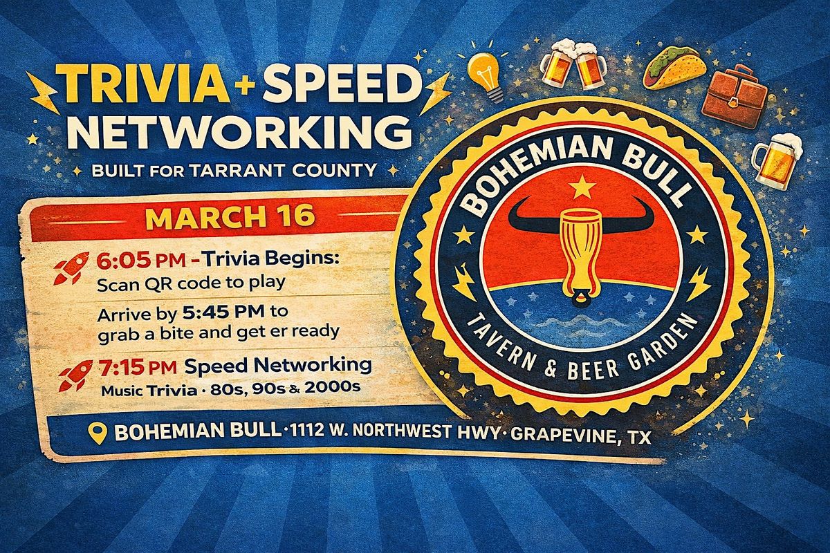Start with fun music trivia at 6:05 PM (arrive early for burgers & drinks), then jump into speed networking at 7:15 PM. Build real connections, laugh a little, and grow your network—all without leaving Tarrant County.