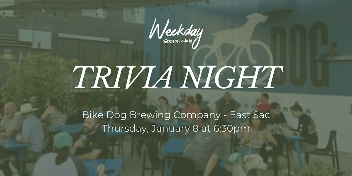 Team up with The Weekday Social Club for a trivia night at Bike Dog Brewing East Sac on January 8, 2026 at 6:30 PM (trivia starts at 7pm)! It'll be a fun-filled evening of brain-teasing questions and delicious brews. Test your knowledge, enjoy great company, and maybe even win some cool prizes!