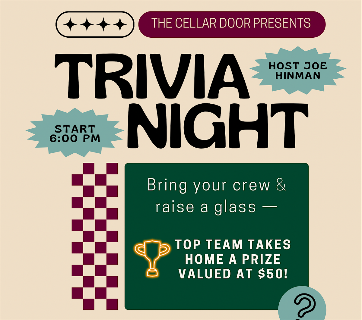 Trivia starts at 6:00 PM, and the top team takes home a prize valued at $50.
