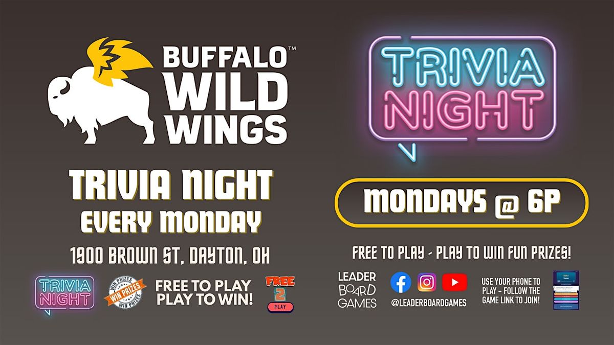 Trivia Game Night at Buffalo Wild Wings - Dayton OH every Monday at 6pm! Test your knowledge, compete for prizes, and enjoy a fun-filled evening of trivia and laughter with your team. Free to Play - have to Play to WIN PRIZES!