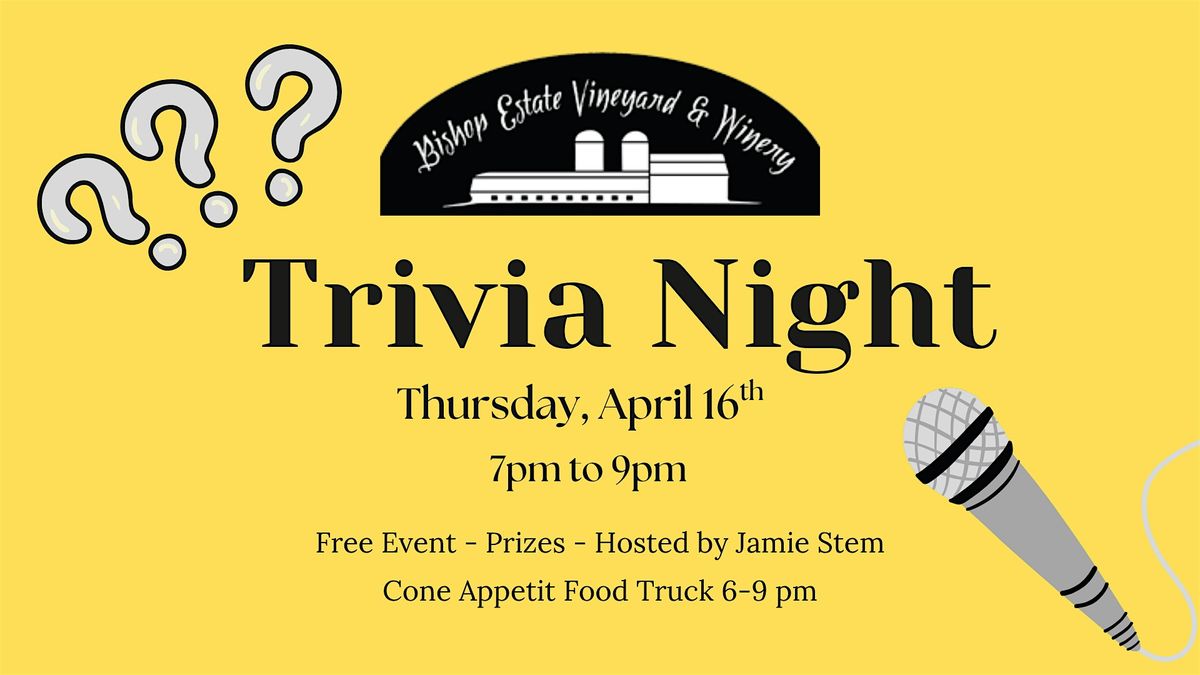 Join us for a fun-filled evening of brain-teasing questions and delicious wine at Bishop Estate Vineyard and Winery hosted by Jamie Stem. Test your knowledge on a variety of topics while sipping on our exquisite wines. Gather your friends and family for a memorable night of laughter and friendly competition.