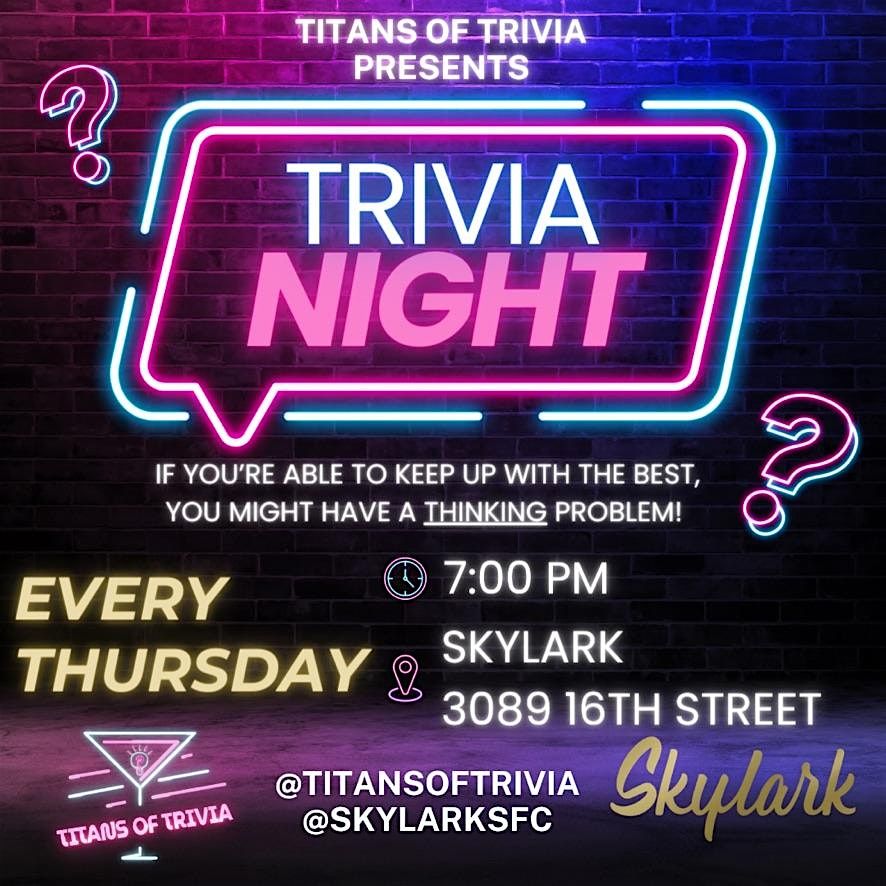 Come join us for a fun-filled evening of brain teasers and laughs at Skylark! Test your knowledge on a variety of topics while enjoying great company and even better drinks. The event will be held at 3089 16th St, so make sure to mark your calendars. Whether you're a trivia pro or just looking for a good time, this event is perfect for you. Don't miss out on the chance to win some awesome prizes and bragging rights! See you there!