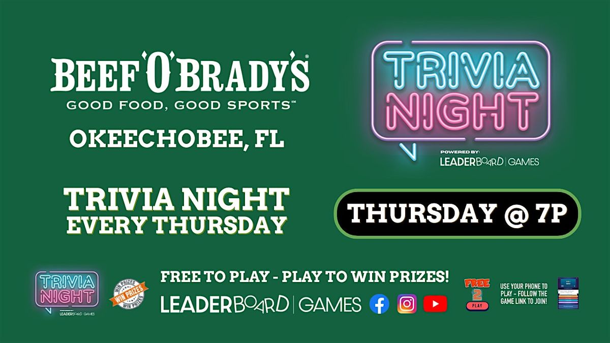 Trivia Game Night at Beef 'O' Brady's - Okeechobee FL every THURSDAY at 7pm! Test your knowledge, compete for prizes, and enjoy a fun-filled evening of trivia and laughter with your team. Get your best team together and join. Free to Play - have to Play to WIN PRIZES!