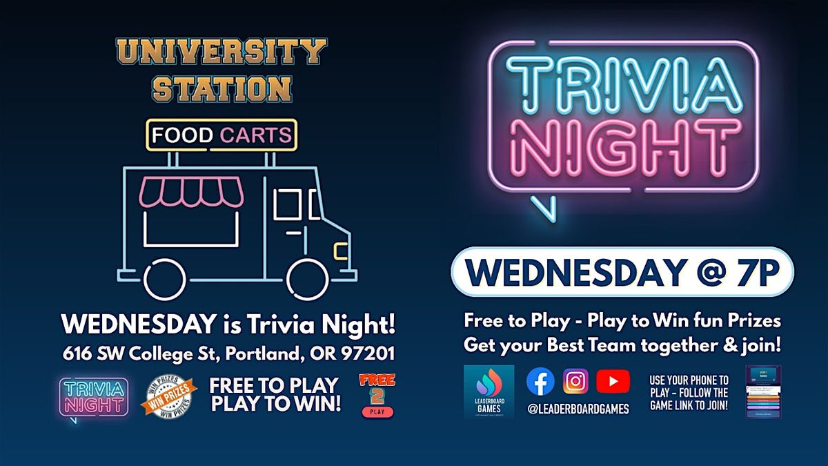 Trivia Game Night at University Station Food Carts - Portland OR every Wednesday at 7pm! Test your knowledge, compete for prizes, and enjoy a fun-filled evening of trivia and laughter with your team. Free to Play - Win PRIZES!