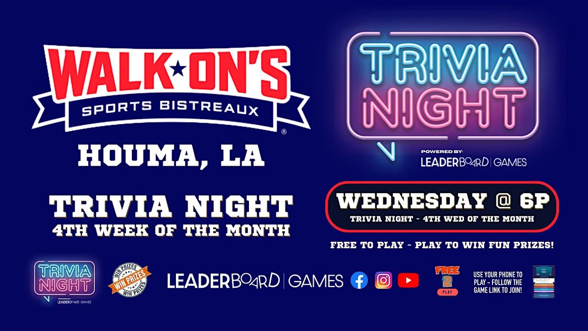 Trivia Game Night at Walk-On's Sports Bistreaux - Houma LA on the 4th Wednesday of the Month at 6pm! Test your knowledge, compete for prizes, and enjoy a fun-filled evening of trivia and laughter with your team. Free to Play - Win PRIZES!