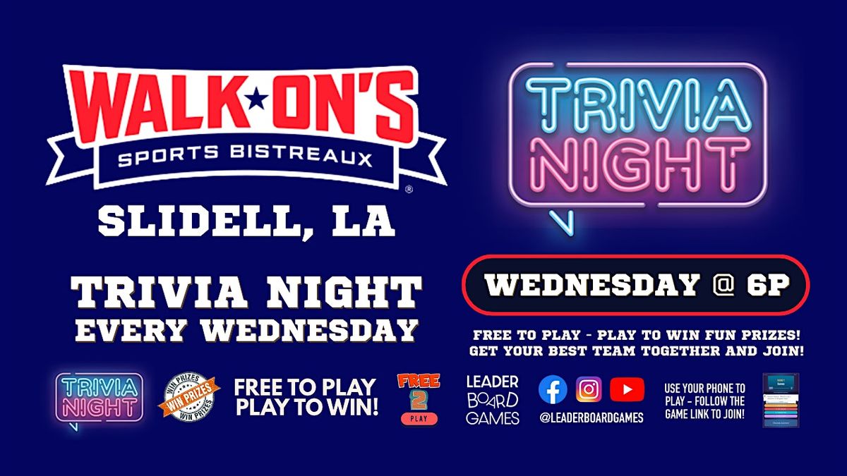 Trivia Game Night at Walk-On's Sports Bistreaux - Slidell LA Wednesday at 6pm! Test your knowledge, compete for prizes, and enjoy a fun-filled evening of trivia and laughter with your team. Free to Play - Win PRIZES!