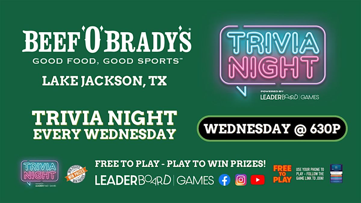 Trivia Game Night at Beef 'O' Brady's - Lake Jackson TX every WEDNESDAY at 630pm! Test your knowledge, compete for prizes, and enjoy a fun-filled evening of trivia and laughter with your team. Get your best team together and join. Free to Play - have to Play to WIN PRIZES!