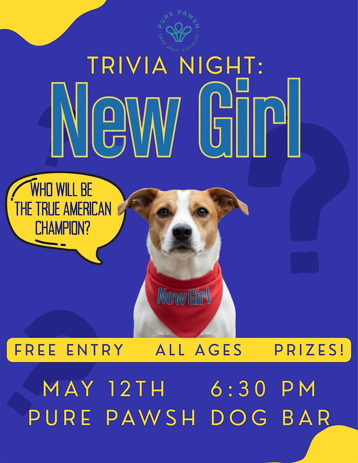 Join us at Pure Pawsh Dog Bar on May 12th at 6:30 PM for New Girl Trivia Night-because true fans know it’s not just a show, it’s a lifestyle 🍷📺