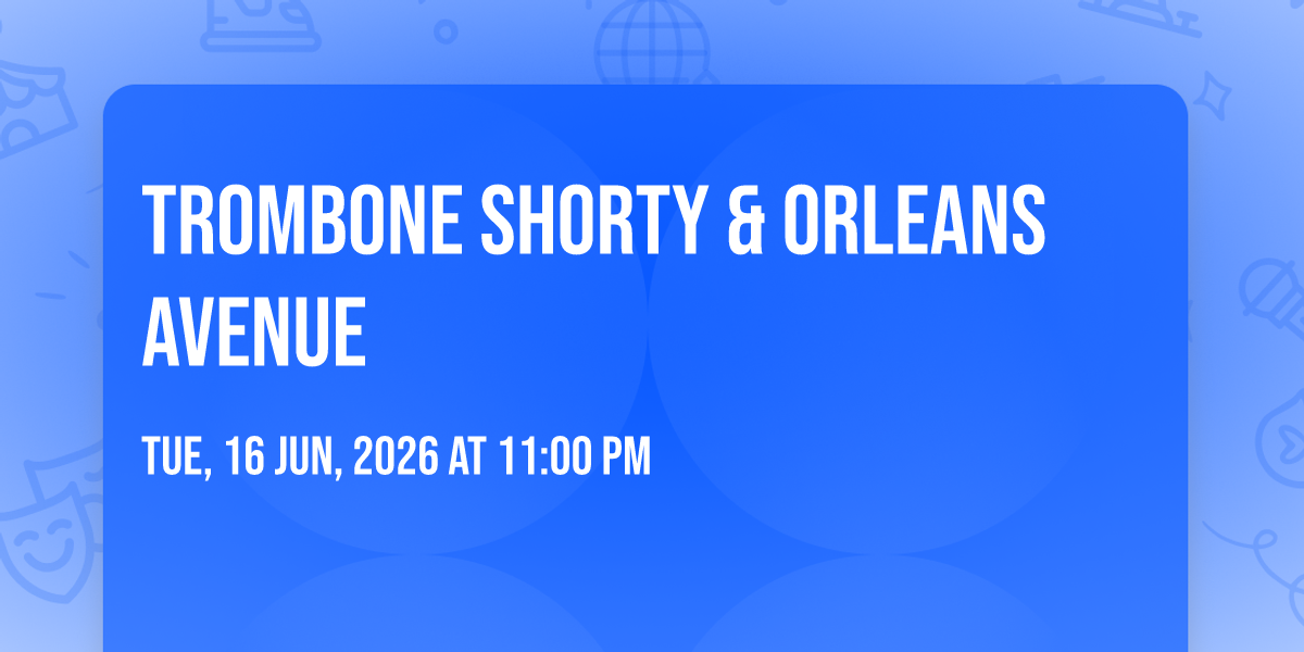 π Location: 41.5078, -81.5615π Welcome to Trombone Shorty & Orleans Avenue, where dreams come alive and possibilities are endless! ποΈ Join us at Evans Amphitheatre At Cain Park in the heart of Cleveland Heights, OH for an event that defies expectations. π On June 16th, 2026 at 11:00 PM, be part of something truly extraordinary as we bring together innovation, entertainment, and pure magic. β¨ Every aspect has been carefully designed to ensure an unforgettable experience for all our guests. Whether you're seeking adventure, inspiration, or simply a break from the ordinary, this event promises to deliver beyond your wildest dreams. π Prepare for a journey into the extraordinary!
