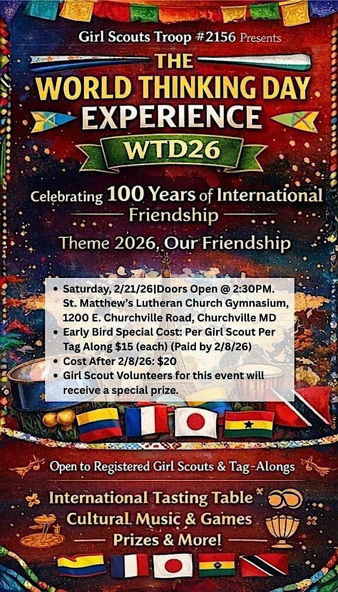 Join us for Troop 2156 World Thinking Day, a fun and meaningful in-person gathering where we celebrate friendship, learning, and global sisterhood. It's a great chance to meet new friends, share stories, and enjoy activities that bring us closer together. Don't miss out on this awesome event filled with excitement and community spirit!