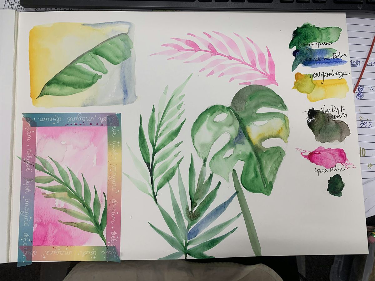 This watercolor workshop will go over the basics. Jenny will share with you wet on wet technique and simple blending options with watercolor. You will first start with a drawing (we will supply patterns) you will trace onto your watercolor paper. Jenny will then share with you how to blend watercolor and create brush strokes creating tropical leaves. You will be working on 140lb watercolor paper and Daniel Smith watercolors.