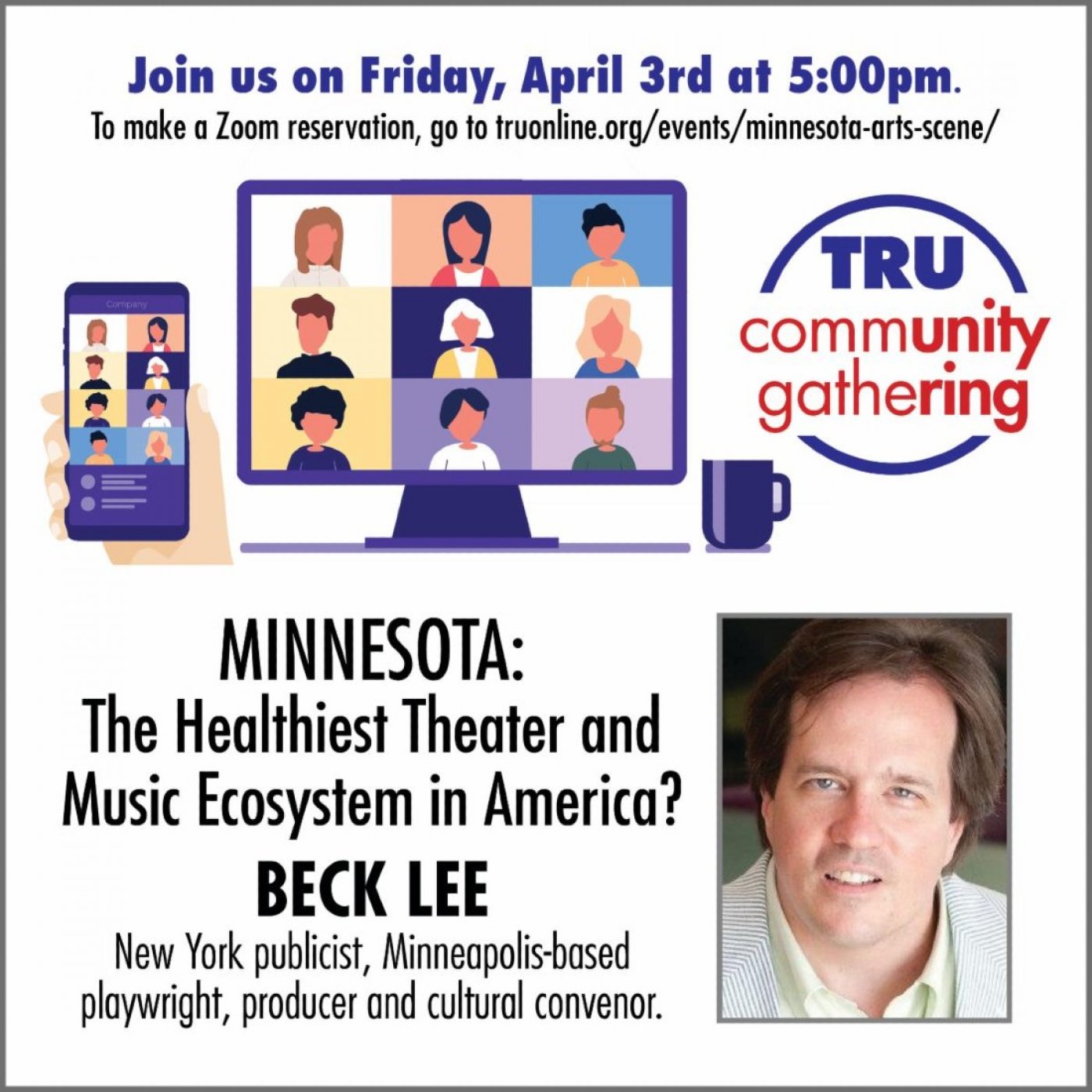 4/3 - Minnesota: The Healthiest Theater and Music Ecosystem in America? In the room: Beck Lee, New York publicist (NY Irish Center, Origin Theatre Company, Spiderwoman/the Downtown Indigenous-feminist company), now a Minneapolis-based playwright, producer and cultural convenor. His non-profit, the Cultural Fluency Initiative, creates events and performances that bring people of different backgrounds together to share their cultural traditions, stories and food. Beck will share his enthusiasm for what he sees as a healthier-than-average arts scene with a rich acting pool, solid arts infrastructure, impressive number of theaters and the highest level of State support of the arts per capita in America. Plus corporate support and individual patronage. "And here's the clincher: the arts in Minnesota are viewed as a civic asset ... something that make us special, something that justifies living through our hellish winters!" What impact have the ICE invasions of the Twin Cities, and a frigid political climate, had on the arts scene here? Plenty, and Beck will share some of that as well as his belief in the resilience of his new home state. Visit https://truonline.org/events/minnesota-arts-scene/ to register and receive the link.