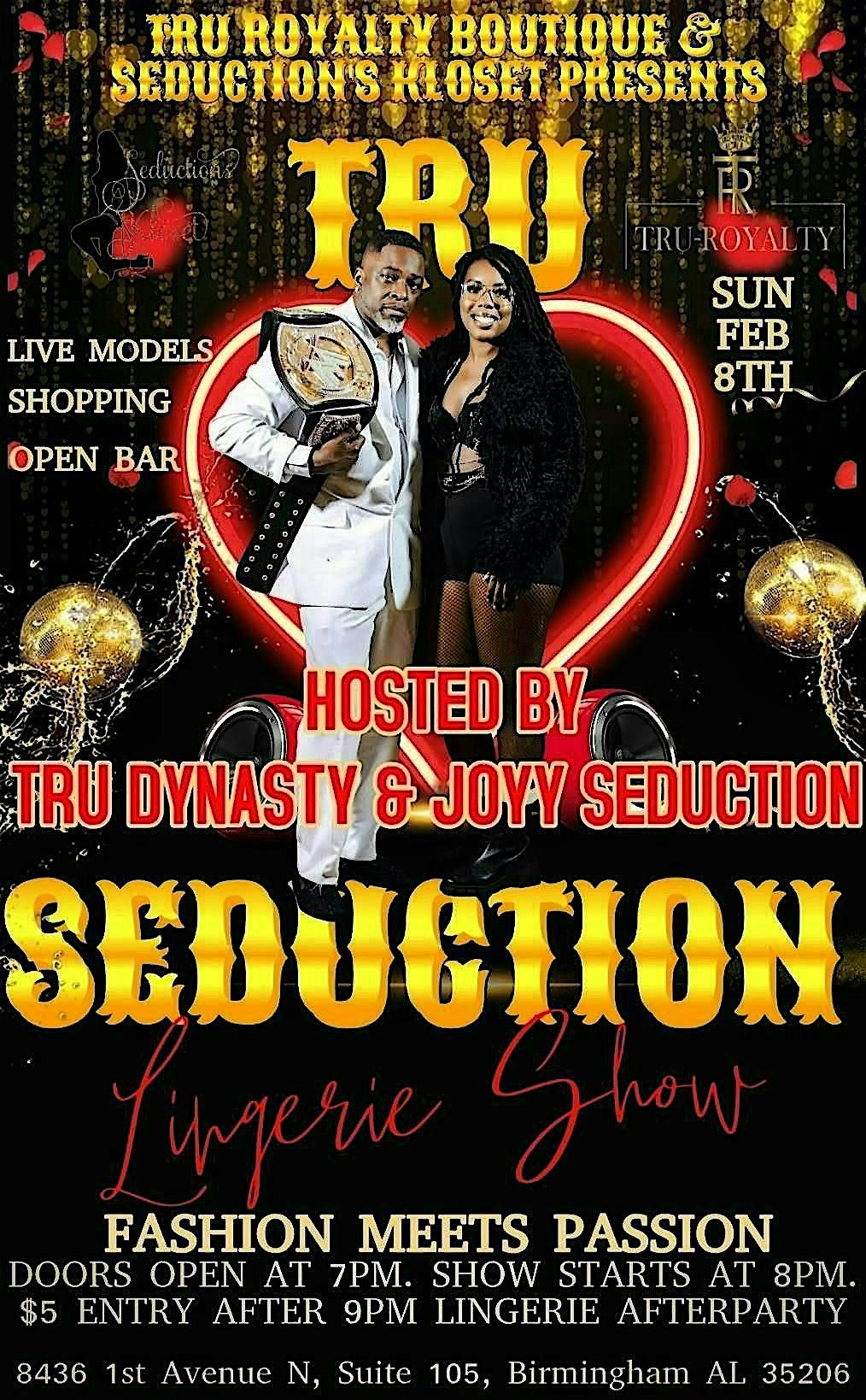 Join us in person for an unforgettable night featuring the hottest lingerie styles and designs. This event is all about confidence, beauty, and that special spark that comes with every outfit. Doors open at 5pm come early to watch the Superbowl and stay for the vibes. $5 entry starting at 9pm when the show starts. Lingerie and adult vendors on site. Whether you're here to or just enjoy the game or the glam, Tru Seduction promises an intimate, fun-filled experience you won't want to miss. See you on the runway!