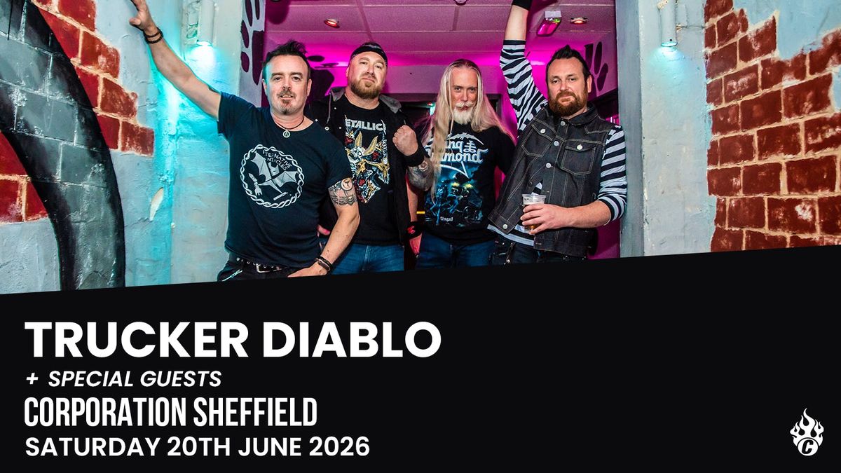One of Northern Ireland’s newer success stories, hard rock outfit Trucker Diablo have been hitting the live scene hard this past 15 years and gathered some unbelievable accolades along the way. Namely, supporting the Foo Fighters, playing the rock and metal hallowed grounds of Donington Castle at Download festival, receiving worldwide airplay including MTV Headbangers Ball, dipping their toe in the gaming world with live favourite ‘Drink Beer, Destroy’ featured on Rock Band 3 on the XBOX.Trucker have been going from strength to strength in past 4 years since the pandemic with their skeleton shattering live sets, featuring their arena sized back catalog from their previous five albums. Recently Steelhouse festivals, Planet Rock Winters End, Winterstorm and Firevolt Festivals all received the foundation shaking Trucker treatment to rapturous applause and compliment.