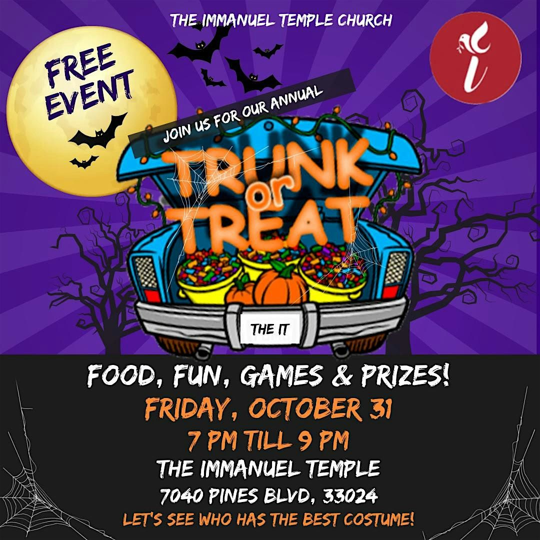 Come join us at The Immanuel Temple for a spectacular evening of fun for the entire family! Get your costumes ready and bring the whole family for a night of trunk-or-treating like no other. Decorated car trunks will be filled with treats for the young and young at heart to enjoy. There will be games, music, and plenty of spirit to go around. Don't miss out on this festive event!