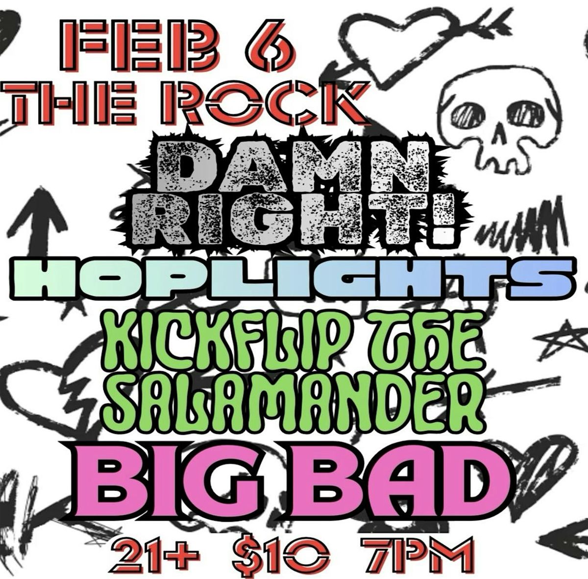 DAMN RIGHT with HOPLIGHTS, KICKFLIP and the SALAMANDER and BIG RAD FRIDAY FEB. 6th at The ROCK!!!