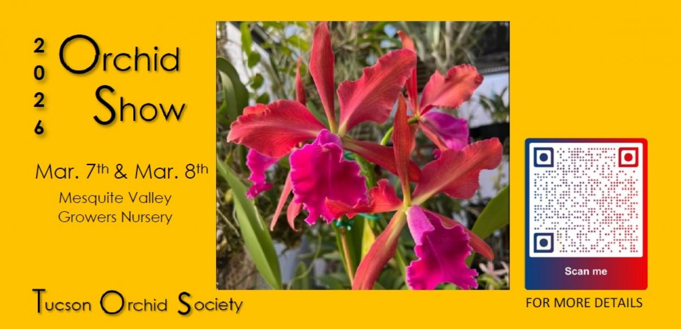 March 7th & 8th of 2026 the Tucson Orchid Society will host its annual Orchid Show and Sale. Come visit us at Mesquite Valley Growers (8005 E. Speedway Blvd. Tucson, Az) and experience the beautiful orchids grown by our members here in the desert southwest. We will also have unique orchids for sale not found locally and you can meet our growers and discover the secrets of growing Orchids in the Desert.