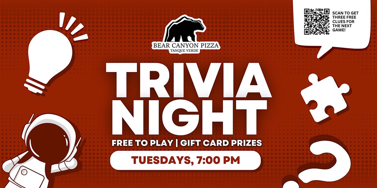 Join us for free live trivia every Tuesday at 7pm at Bear Canyon Pizza Tanque Verde in Tucson! Free to play, and top teams win gift card prizes!