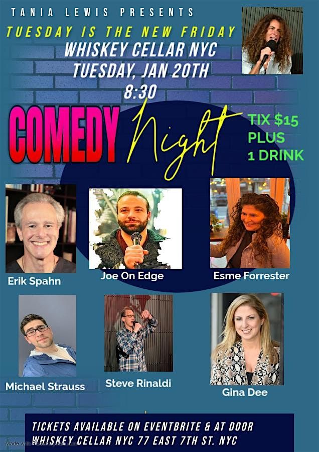 Whiskey Cellar NYC hosts the monthly stand up show (Tuesday is the new Friday). Producer Tania Lewis presents up and coming and established NYC comedians for a 90 minute- fun-filled performance. This month features Gina Dee, Joe on Edge, Steve Rinaldi, Erik Spahn, Michael Strauss and MC/Producer Tania Lewis