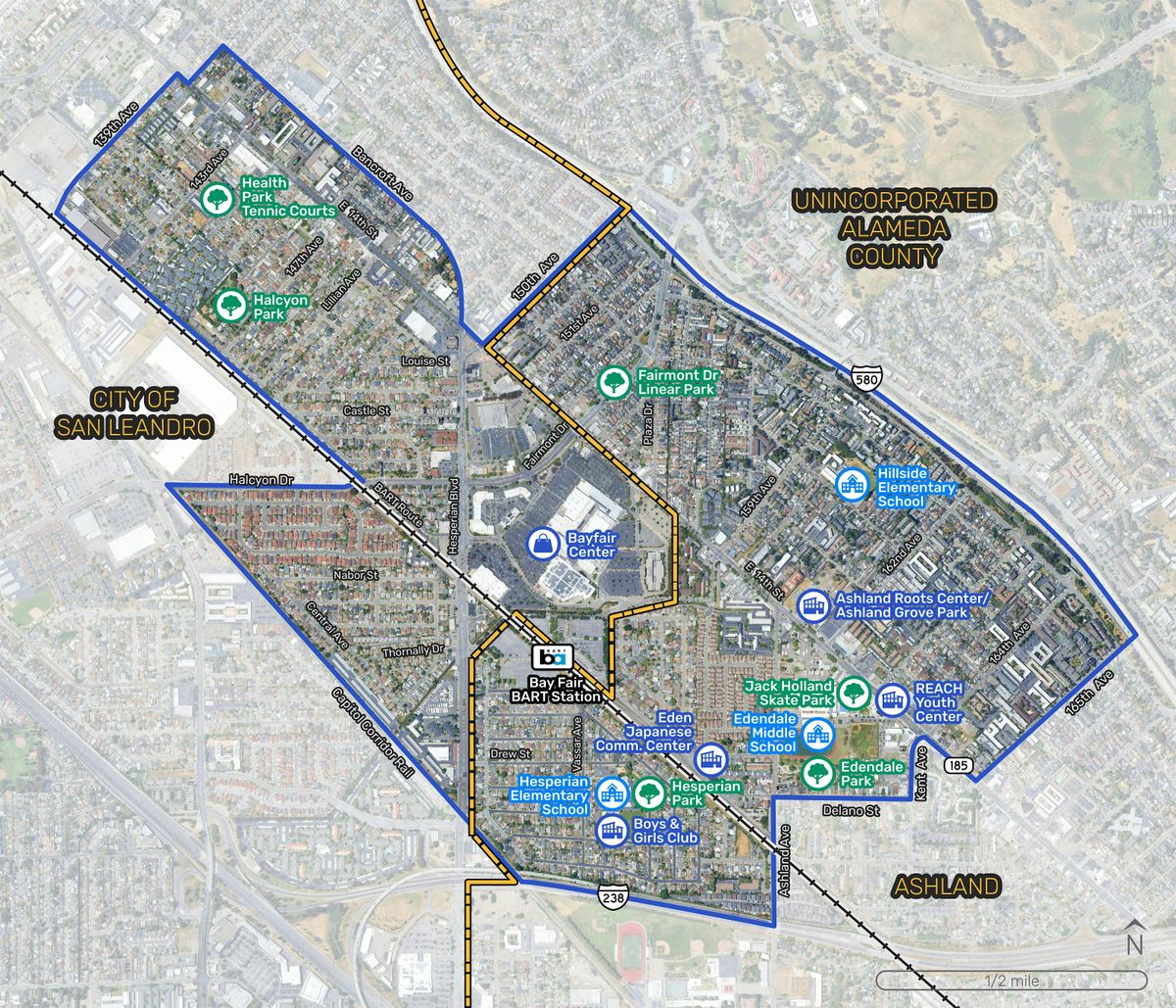 Nakatuon ang CBTP na ito sa pagtukoy ng mga pagpapabuti sa mga pampublikong kalsada at bangketa sa paligid ng Bay Fair BART Station, kabilang ang mga bahagi ng San Leandro at mga unincorporated na lugar ng Alameda County.