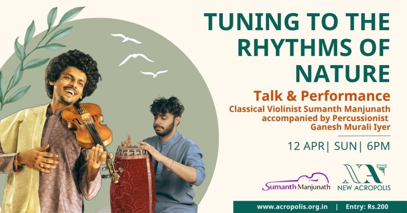 In the Indian Classical Music tradition, music reflects Nature's rhythms, patterns and cycles. New Acropolis invites you for an evening of Music and Philosophy where violinist Sumanth explores this deep connection. Through a talk and performance, we will explore how our own human conversations have a rhythm; and how certain classical ragas are not just inspired by nature, but in a sense, are able to communicate with nature. The evening will conclude with a performance, specially composed by Sumanth to celebrate this evening.