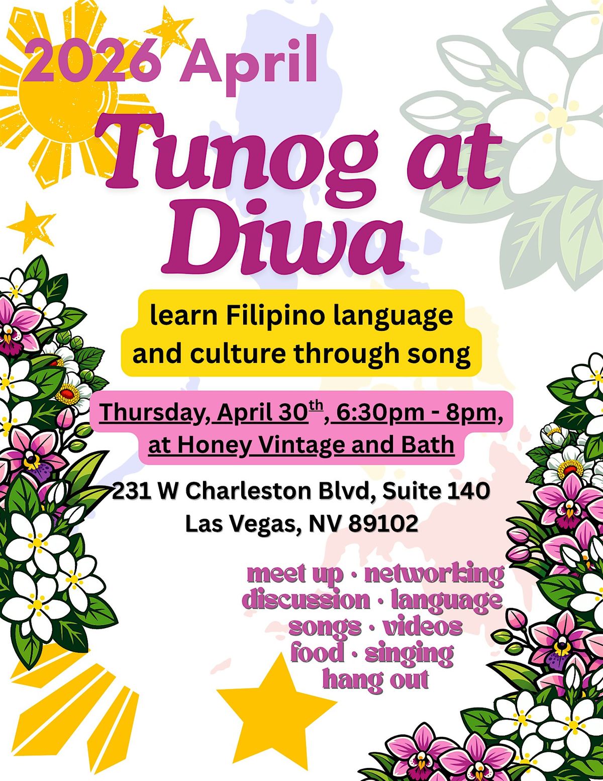 Join us at Honey Vintage and Bath on April 30, 2026 at 6:30 PM (PDT) for a fun and relaxed evening! Dive into the Filipino language and culture through beautiful songs that bring stories and traditions to life. Whether you're a beginner or just curious, this event is a great way to connect with the spirit of the Philippines. Bring your friends and enjoy a unique cultural experience in a cozy setting!