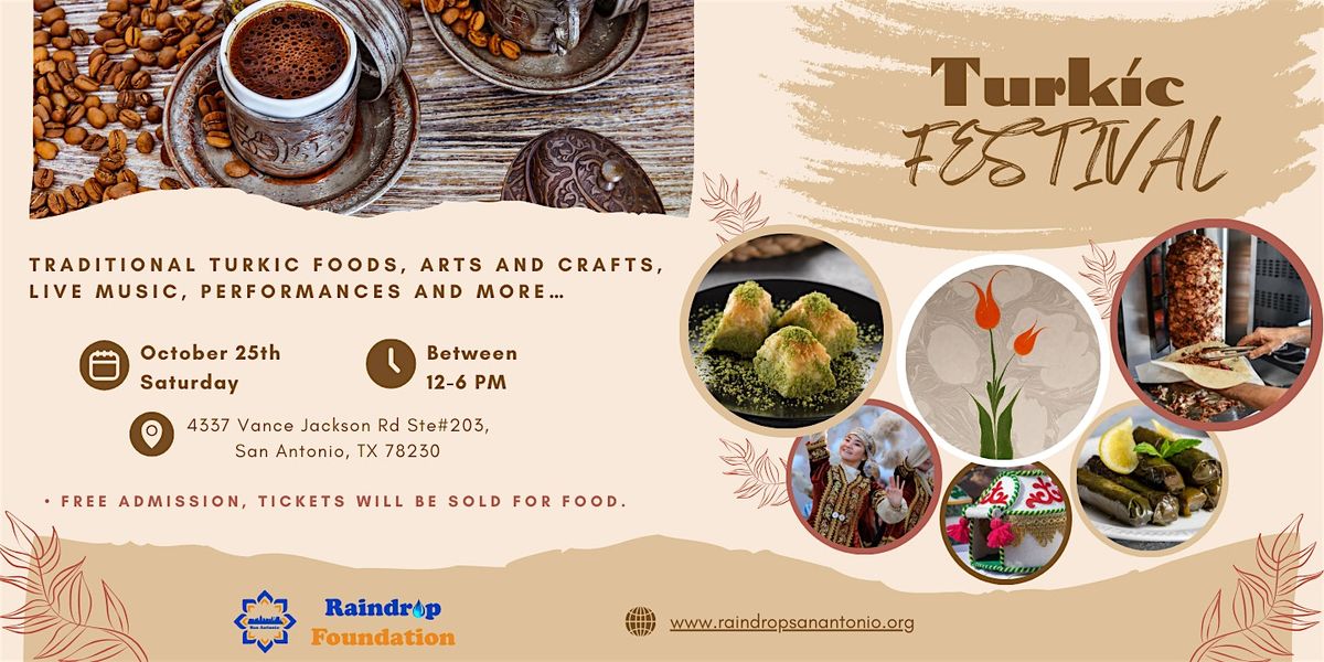 Come join us on Sat, October 25, 2025 at Raindrop Foundation San Antonio for a day filled with delicious food, live music, folk dance and vibrant art performances. Experience the rich heritage of the Turkic (Azerbaijan, Kirgizistan, Kazakhstan, Turkmenistan, Turkiye, and Tajikistan) people through traditional decorations, art displays, and interactive workshops.