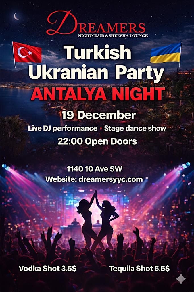 Join us for an unforgettable night blending the vibrant vibes of Turkey and Ukraine right here in Antalya! It's an in-person party where you can dance, chill, and soak up the best of both cultures. Expect great music, tasty bites, and awesome company. Don't miss out on this epic cultural fusion under the stars. Let's make memories together at the TURKISH & UKRAINIAN Party — see you there!