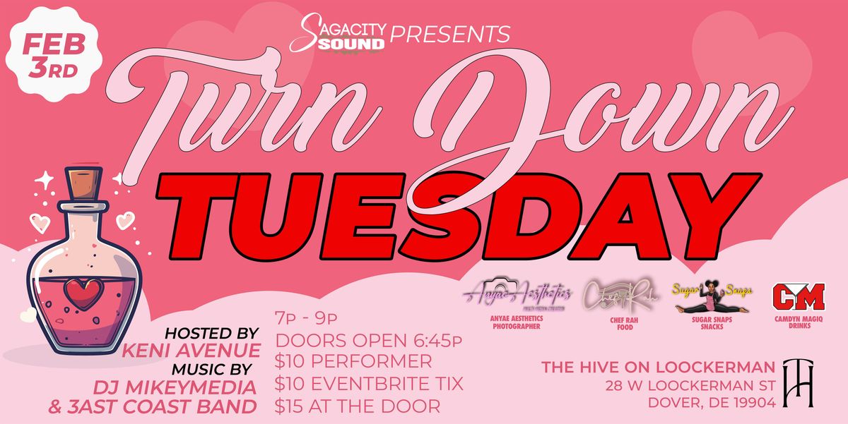 On Tue February 3rd 2026 at 7:00 PM we are hosting an amazing evening so mark your calendars and bring your friends along for a memorable night of entertainment. Let's make Tuesdays the highlight of your week with Turn Down Tuesdays: Open Mic Experience! We've got amazing artists, vendors, a mixologist, an in house band, dj, and more surprises that you dont want want to miss! This special event is "Heartfull or Heartbreak Themed"! Pull out your best red , pink, hearts or even black for Valentines Day to join the the party!