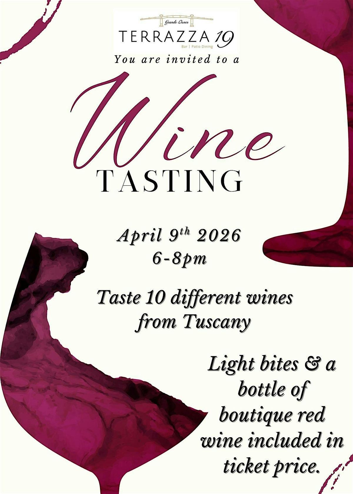 Join us for a fun evening exploring the rich flavors of Tuscany right here at Terrazza 19. Sip on some amazing wines and enjoy great company!